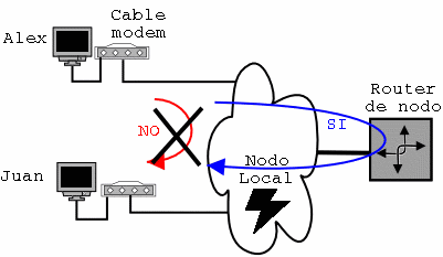 Hay uno o más nodos por ciudad. Los usuarios o clientes (Alex, Juan...) estan conectados en red local al nodo a través de cable coaxial, y en cada nodo se gestiona la conexión a Internet de los usuarios conectados a él.